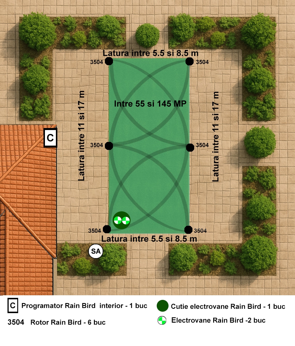 Atentie! Kit ul este potrivit numai suprafete intre 55 si 145 mp, cu forma dreptunghiulara si laturi ale suprafetei intre 5.5-8.5m si 11-17m. Kit-uri pentru alte suprafete, gasiti aici. Pentru ca irigatia sa functioneze corect, sistemul de pompare, (sau reteaua de apa) trebuie sa furnizeze 2.0 mc/h si o presiune de 3,5 bari. Daca alimentarea cu apa se face de la retea, teava de apa, la iesirea din contor, trebuie sa aiba minim 25 mm.