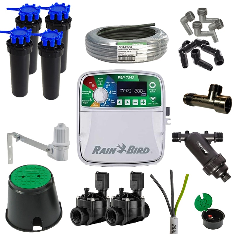 Kitul conține aspersoare rotative Rain Bird, electrovalve, teuri, conectori și cabluri necesare pentru un sistem robust și durabil. Toate piesele sunt configurate pentru compatibilitate ușoară și funcționare eficientă.