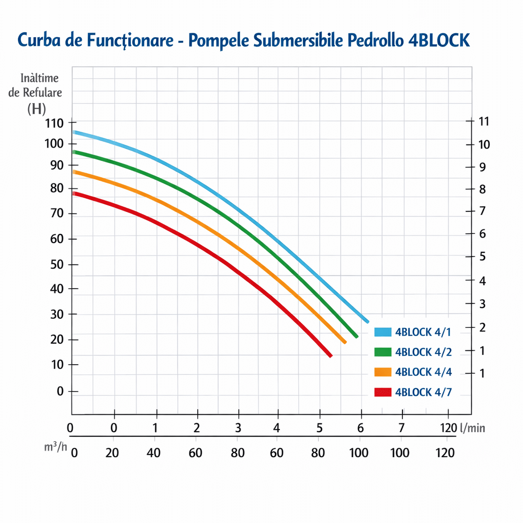 Aceste curbe sunt esențiale pentru a alege pompa potrivită și pentru a calcula dacă un model acoperă cerințele sistemului tău de irigație sau alimentare cu apă. În cazul modelelor din seria 4-BLOCK, curbele de performanță arată limitele de debit și înălțime pentru fiecare variantă, astfel încât să poți evalua capacitatea de a furniza apă la presiunile dorite.